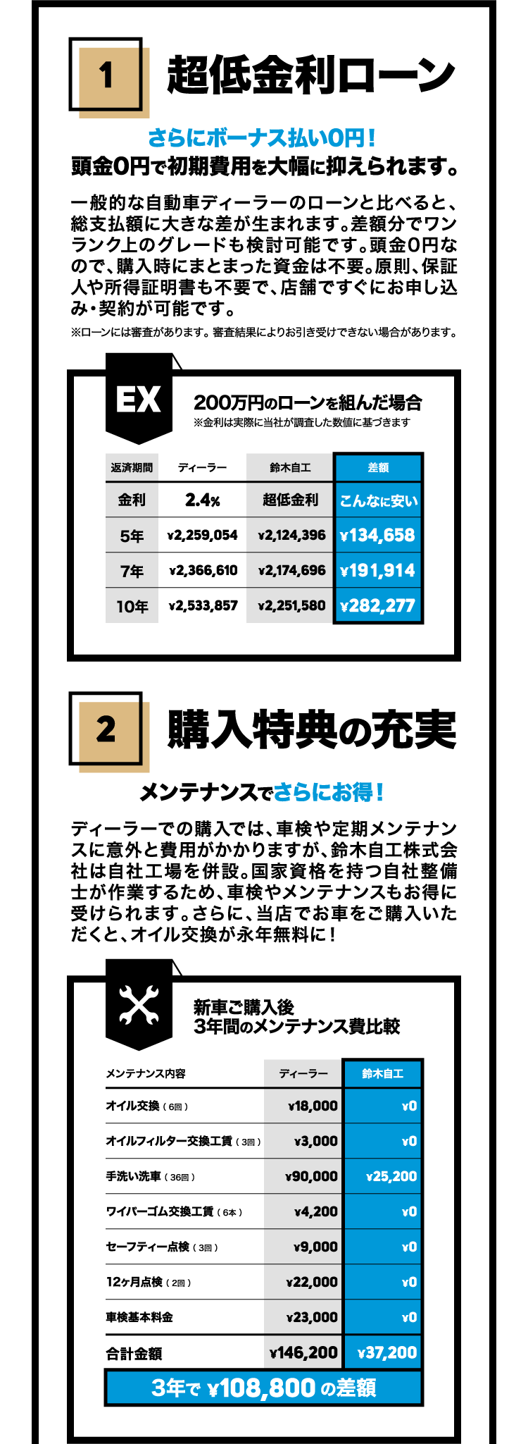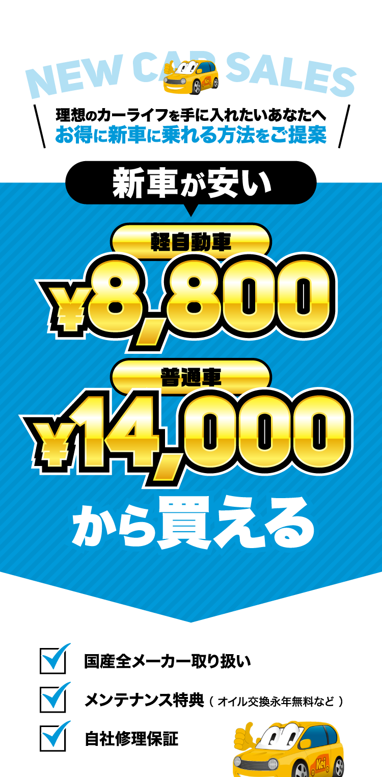 - A. コバックカーズ・軽ひろば特別金利を採用している為、一般的に低金利と言われている銀行ローンと比べても、非常に安い金利でご利用頂けます。