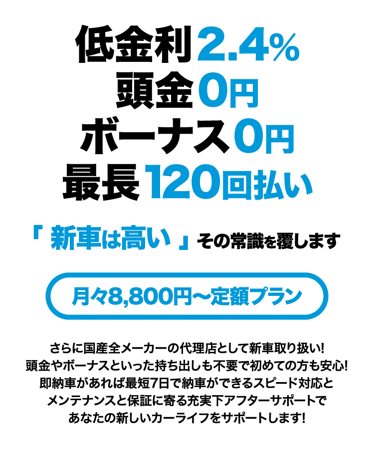 コバックカーズ・軽ひろばは、ディーラーや他店の金利相場3.5%~8%よりも圧倒的に低い2.4%なので、新車・未使用車本体価格は一緒でも、支払い額に大きな差が出てくるのです。